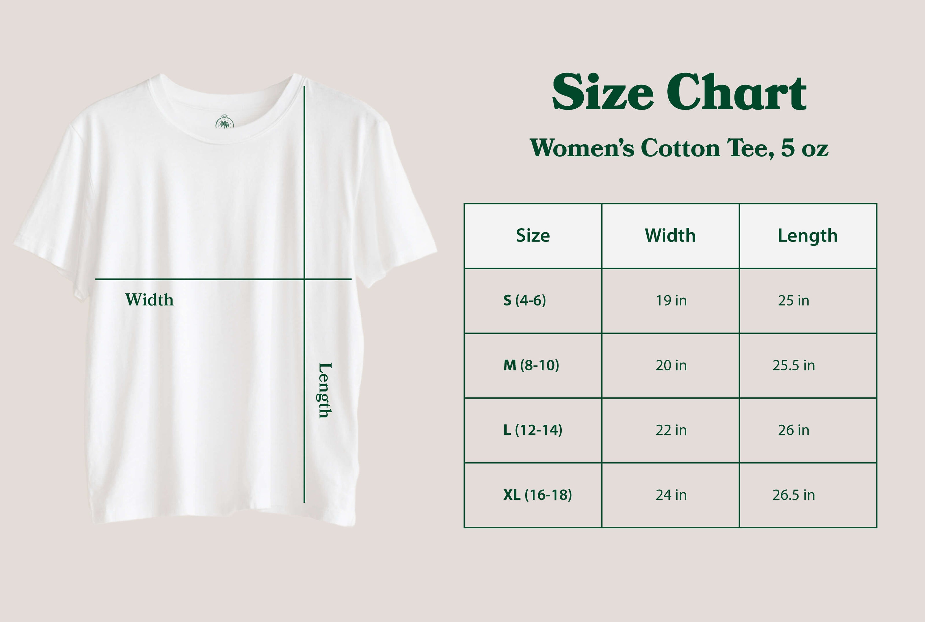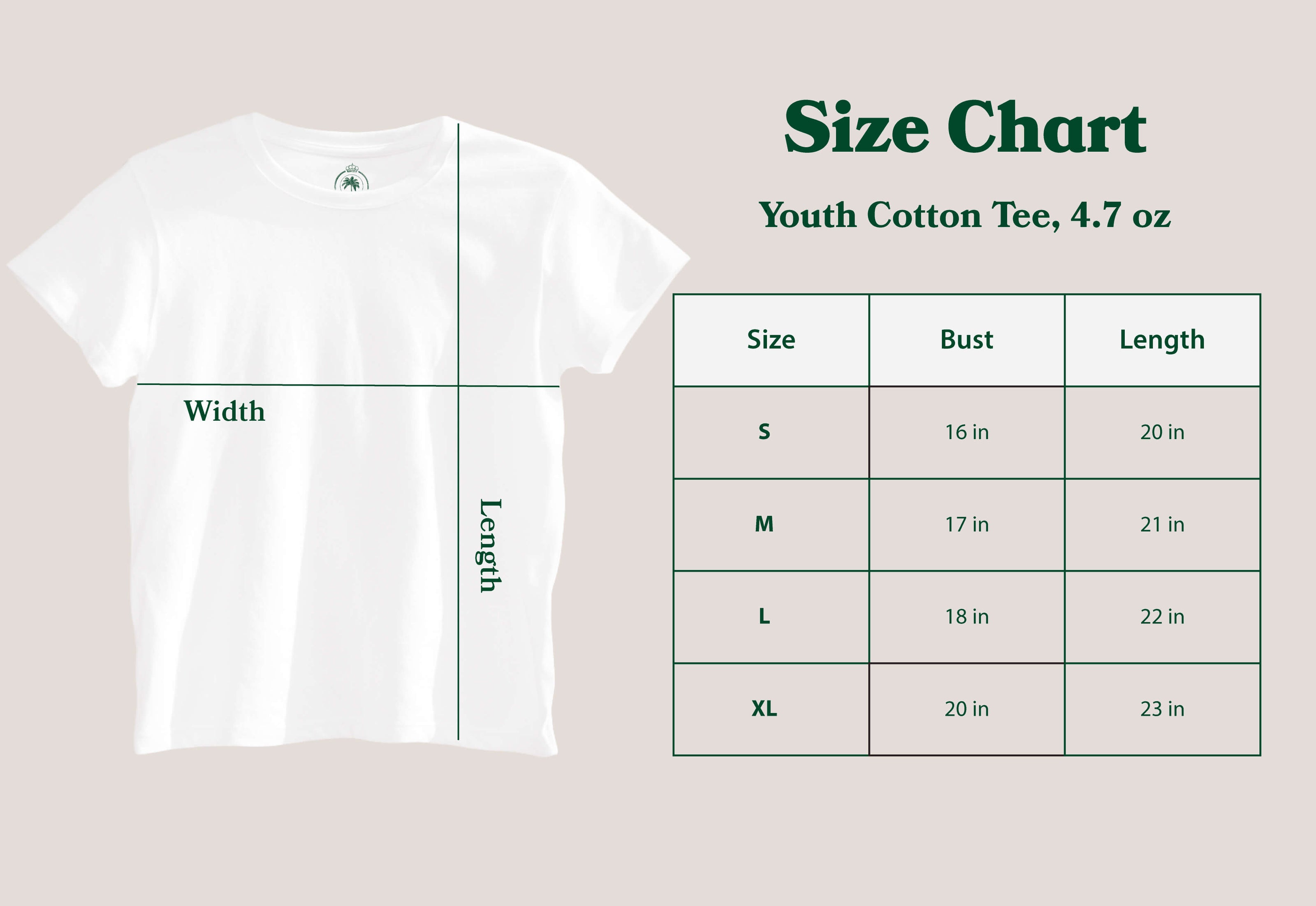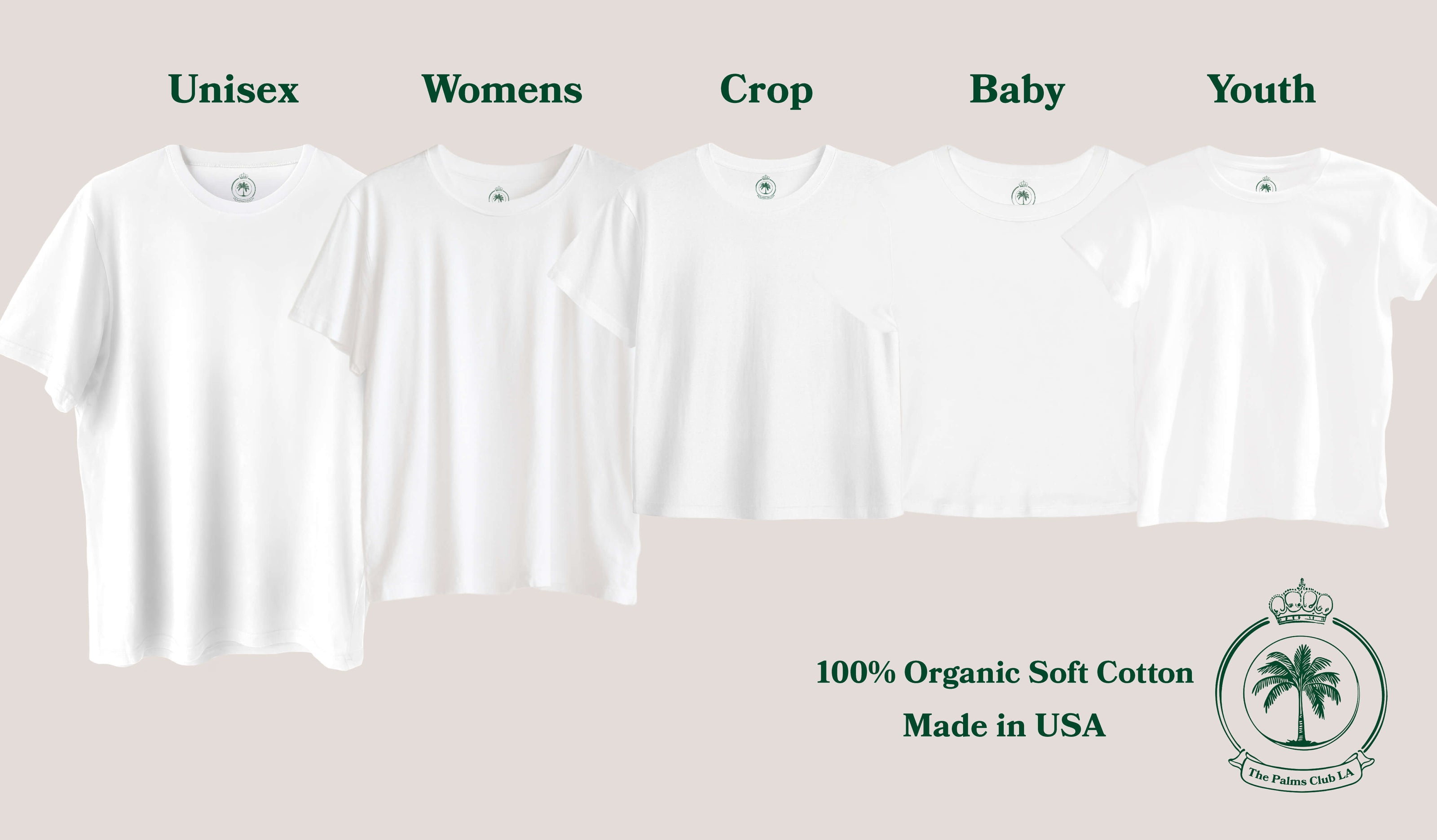 White t-shirts labeled for different sizes and types on a beige background with branding and text.