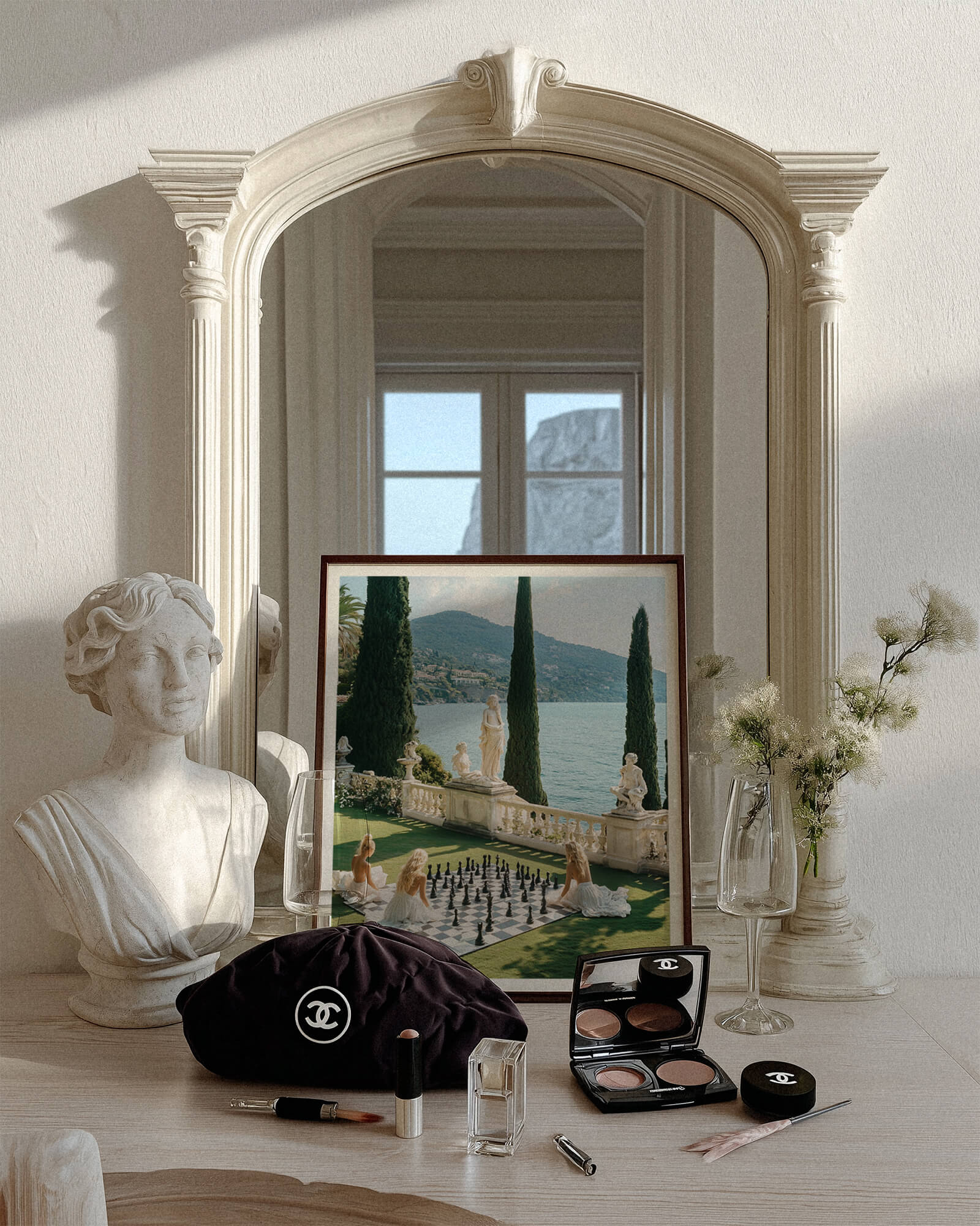 Elegant Vintage Film Wall Art. Photo print of women playing chess on the French Riviera, surrounded by statues, cypress trees, and sea views. Captured in soft, vintage film style for a timeless European look.