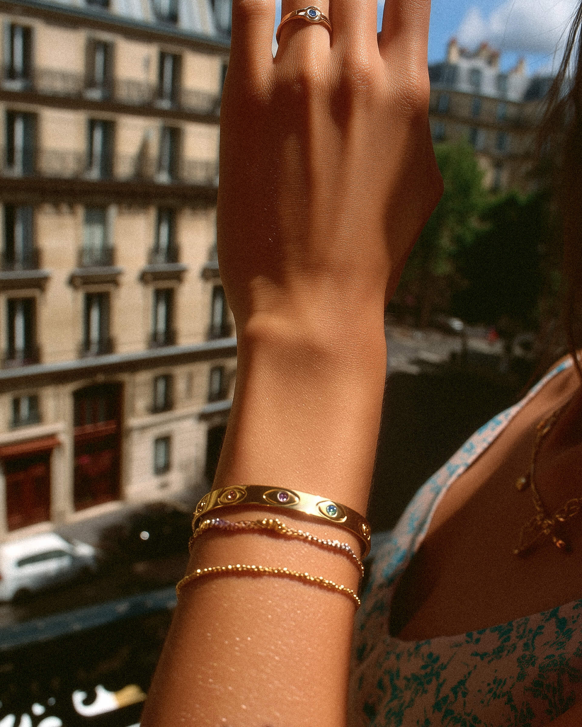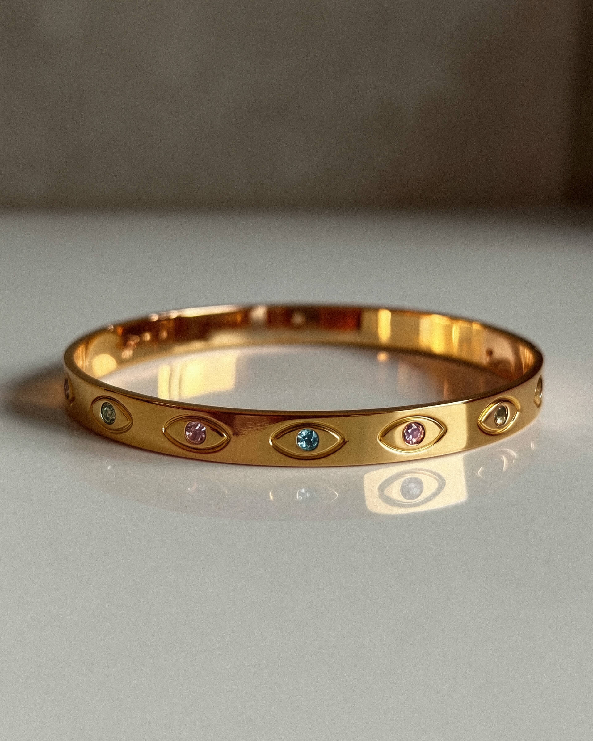 Protection, polished in gold. This Evil Eye Bracelet is crafted in 18k gold-plated 316L stainless steel with a sleek, Cartier-inspired silhouette. Each engraved eye holds a shimmering gemstone in blue, pink, and white, symbolizing truth, love, and protection.